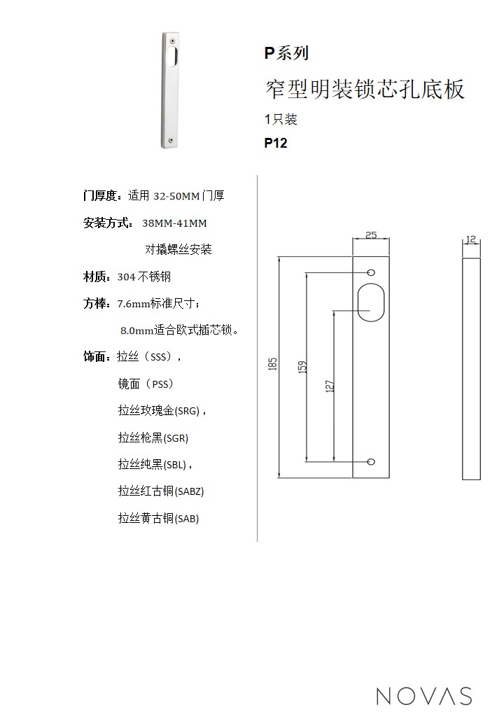 窄型明裝防盜鎖芯孔底板 1只裝 P12