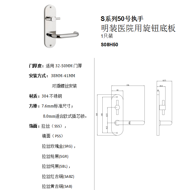 > S系列產品50號執手 明裝病院用轉鈕底板