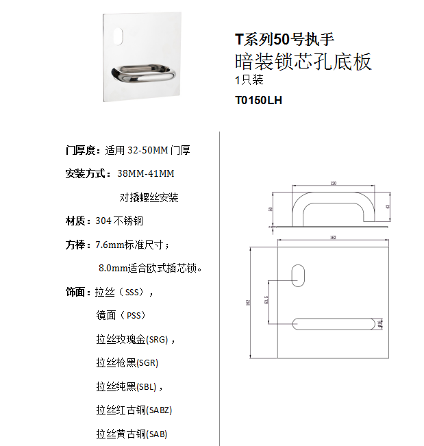 T系列50號執手 暗裝鎖芯孔底板